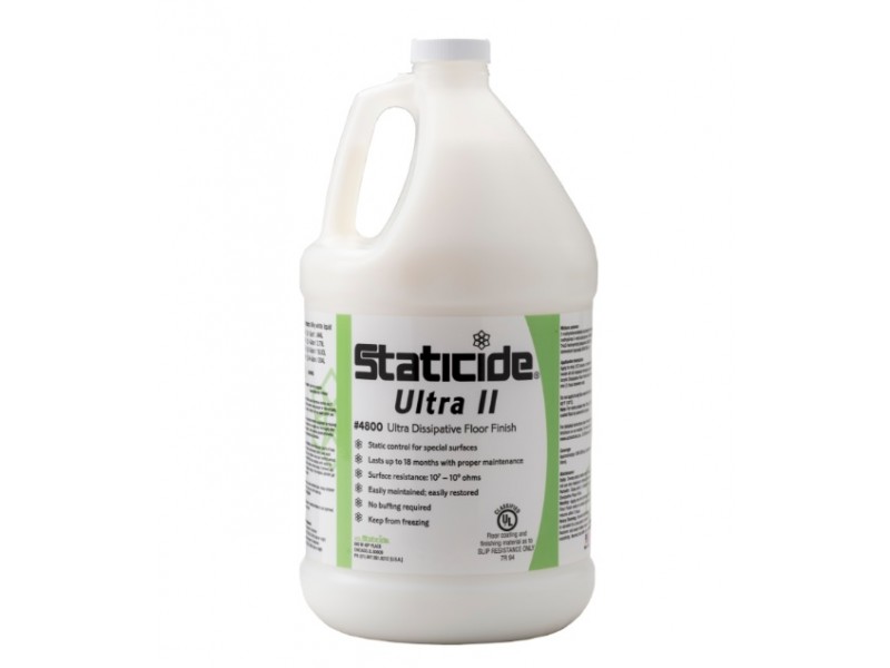 The urethane-enhanced formula’s high abrasion resistance and durability leave floors static dissipative, glossy, and protected for 12-18 months. It does not yellow or flake and is tough to scuff. Staticide® 4800 Ultra II Floor Finish is ideal for any environment where static control is required and ESD flooring is installed, including sensitive device manufacturing areas.