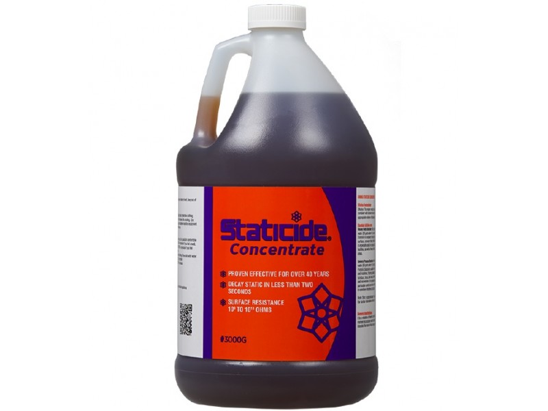 Staticide® General Purpose is a 99 parts solvent (water) to 1 part concentrate mixture. Staticide® General Purpose is intended for non-porous surfaces and is suitable for use on machines, fixtures, paneling, tile, office furniture, trays, tote boxes, most films, plastics, paper, and non-woven fabrics. It is especially helpful for static and particulate control as well asenvironmental static control in sensitive areas.